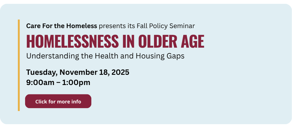 For 40 years, Care For the Homeless has fought homelessness by delivering high-quality and client-centered health care, human services and shelter to homeless individuals and families, and by advocating for policies to ameliorate, prevent and end homelessness.